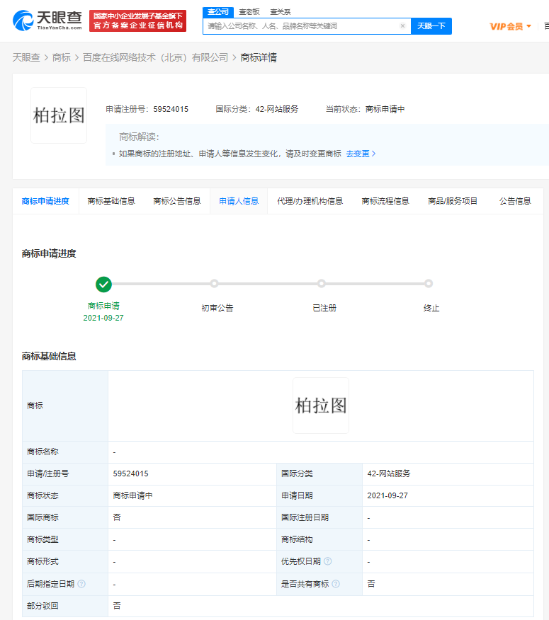 百度正式申请注册“柏拉图”商标 涉及网站服务、科学仪器等